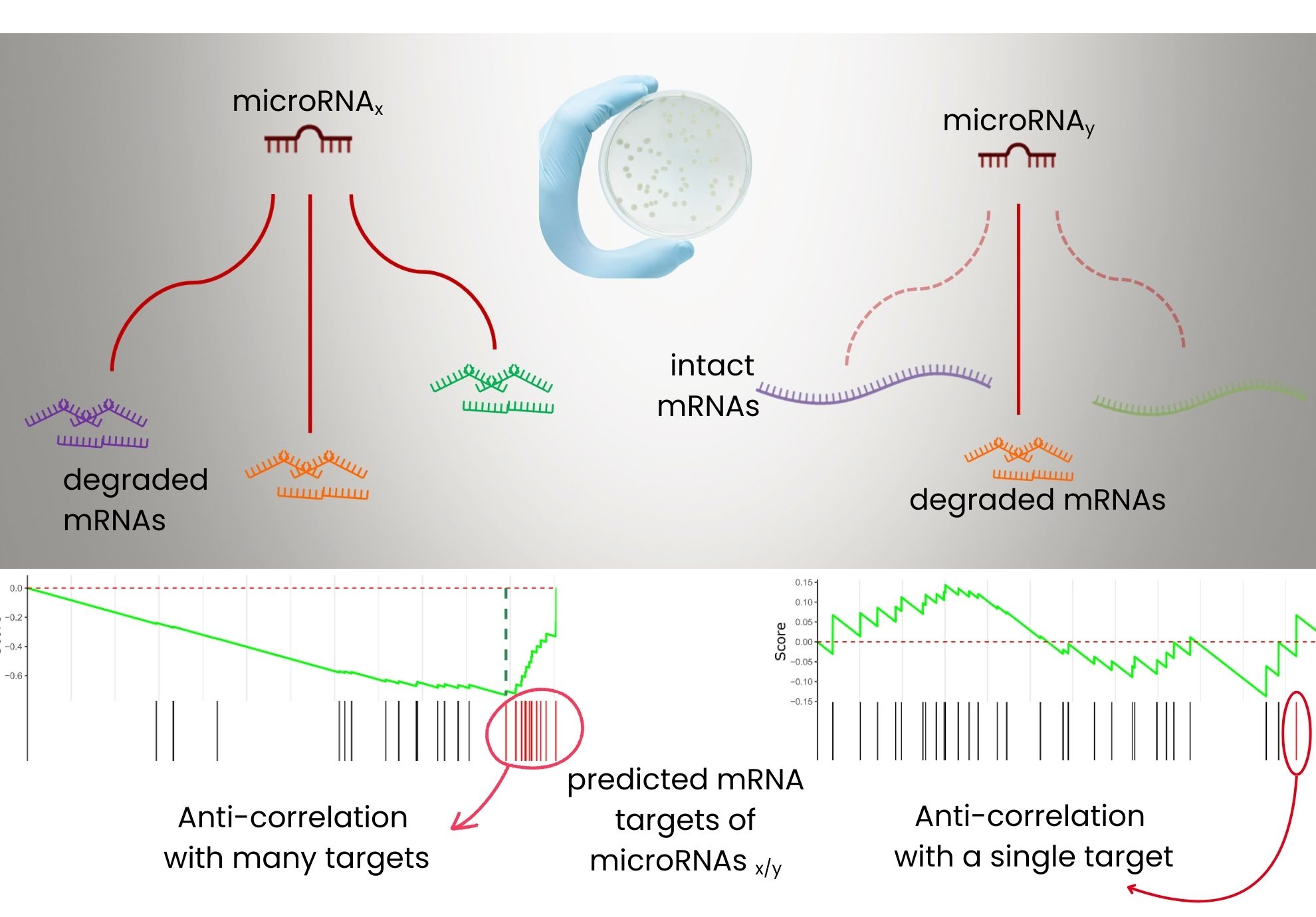 Statistical analysis of Single-Cell co-sequencing of microRNA-mRNA: Left, a microRNA degrading multiple mRNA targets, predicted both by an algorithm and by strong anticorrelation of expression. Right, a microRNA acting on a single target only, highlighting the diversity of regulatory mechanisms.